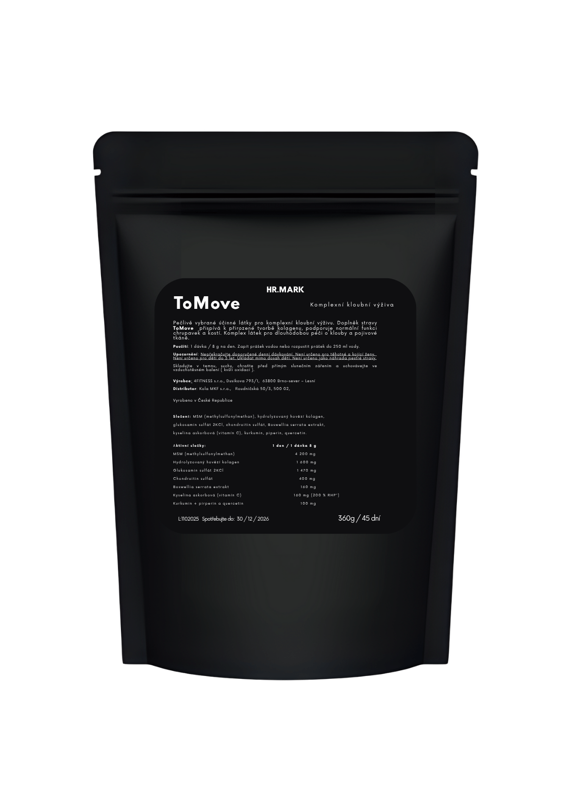 ToMove je komplexní doplněk stravy navržený pro dlouhodobou péči o klouby, chrupavky, vazy, šlachy a kosti. Obsahuje kombinaci ověřených látek – kolagen, glukosamin, chondroitin, MSM, Boswellii serrata, kurkumin s piperinem, quercetin a vitamin C – které společně působí synergicky a přispívají k udržení pohyblivosti a pružnosti kloubů.